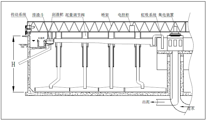 4、該設(shè)備運(yùn)行平穩(wěn),吸泥、刮浮渣能同時進(jìn)行,能耗省。